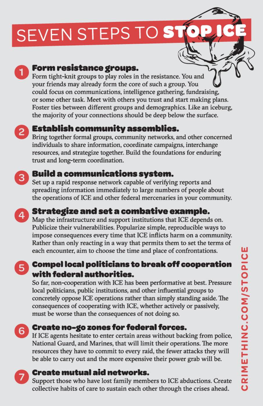 Connect attendees to local struggles against ICE infrastructure, such as deportation facilities and flock cameras, or against other threats, such as AI data centers. Distribute information about the locations and vulnerabilities of these targets and a few easy actions that anyone can take against them.