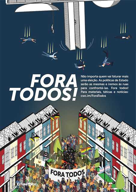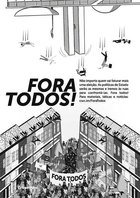 CrimethInc. Support UsNão importa quem vai faturar mais uma eleição. As políticas de Estado serão as mesmas e iremos às ruas para confrontá-las. Fora todos! Para materiais, táticas e notícias: cwc.im/ForaTodos