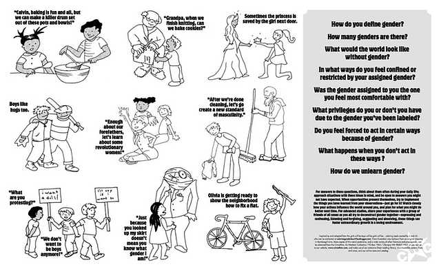 Inspired by and adapted from the girls will be boys will be girls will be… coloring book created by JT and Irit, who can be contacted at colormegenderless@facehugger.com. Front illustration was redrawn from an original drawing in Bamboogirl zine.