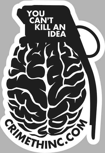 “You Can’t Kill An Idea,” says the fuse of a grenade with a brain for a charge and body. The URL crimethinc.com arcs underneath the brainade.